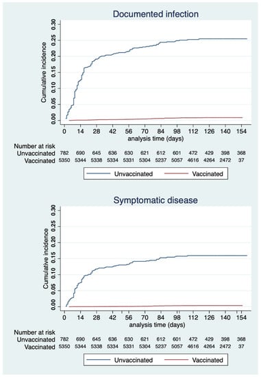 Cumulative incidence of documented infection and symptomatic disease, by group (vaccinated vs. unvaccinated), expressed using Kaplan–Meier estimator.