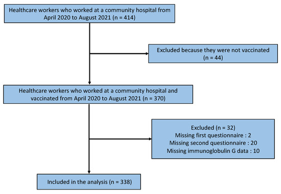 Figure 1 shows a flowchart of the participant selection process. A total of 414 healthcare workers worked at the hospital from April 2020 to August 2021, of whom 370 were vaccinated between April 2020 and August 2021. Of these, 32 participants were excluded due to a lack of data on the first and second questionnaires or their IgG levels, leaving 338 participants in the analysis (Figure 1).