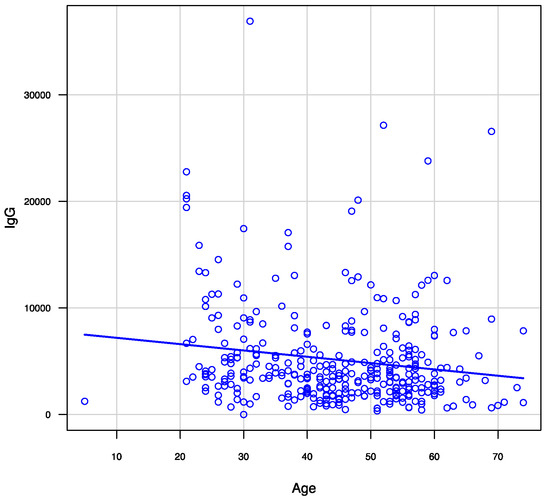 Correlation between age and anti-SARS-CoV-2 IgG levels 3 months after receiving two doses of the BNT162b2 vaccine.