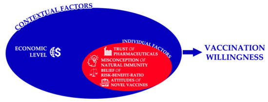In their recent scoping review, Biswas et al. 2021 found that insufficient knowledge about the vaccines was a predictor for COVID-19 vaccine hesitancy among healthcare workers globally [81]. The misconception of natural immunity, which reflects the lack of factual knowledge about immunization, was the second individual predictor of vaccination willingness in our model. This misconception had been profoundly reported among the anti-vaccination parents, and it was dependent on their belief that illness is natural in childhood and the vaccine-preventable diseases are not life-threatening [82]. Therefore, this misconception can also be attributed to the low perceived risk of COVID-19 infection among young adults [3,4,5,6,7]. The general knowledge about vaccines had been consistently reported as a predictor of COVID-19 vaccination willingness, especially in low-income countries, e.g., Bangladesh, Cameroon, Ghana, Nigeria, and Palestine [83,84,85,86,87].