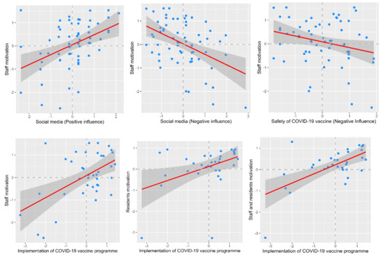 Results for testing correlations between staff and residents’ motivation, social media, safety, and programme and process factor constructs are shown in Table 7. The overall assessment of social media questions (separated into questions with positive and negative connotations) and safety questions were shown to be associated with staff motivation for vaccine uptake, i.e., respondents strongly agreed that social media was an effective method of communication but also effective at spreading negative messaging. No associations were observed with social media, safety, and residents’ uptake. The implementation processes for the vaccination programme were associated with vaccine uptake for both staff and residents (Table 7).