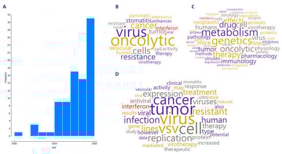 Literature review in the context of resistance to oncolytic viruses. (A) Number of original research articles (a total of 87) that studied resistance to virotherapy in the context of cancer from 2000 to 2020. (B) Frequently used terms in article titles, (C) MESH heading terms, and (D) abstracts.