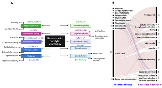 Resistance mechanisms undermining the efficacy of oncolytic viruses. (A) Types of resistance mechanisms and responsible molecular factors studied in reference to oncolytic viruses. The reference number of articles corresponding to the respective resistance mechanisms is provided in brackets. (B) Frequency of studies focusing on a particular resistance source and corresponding mechanism. Each link indicates an article. The number of articles studying a particular resistance source and resistance mechanism is indicated next to the label in grey.
