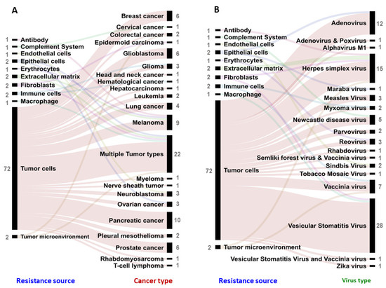 Resistance to oncolytic virotherapy exhibited by different sources or cell types present in the tumor microenvironment. Resistance source assessed in research articles in the context of (A) different cancers and (B) different virotherapy platforms. Each link indicates an article. The number of articles studying a particular resistance source, cancer type, and virus type is indicated next to the label in grey.