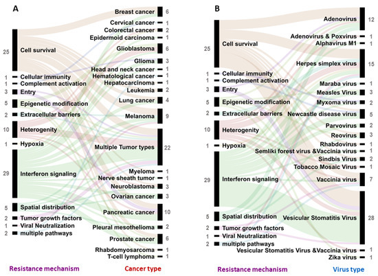 Assessing resistance towards oncolytic viruses in various cancers. Resistance to oncolytic virotherapy exhibited by different mechanisms studied in various articles in the context of (A) different cancer types and (B) towards different virotherapy platforms. Each link indicates an article. The number of articles studying a particular cancer type, virus type, and resistance mechanism is indicated next to the label in grey.
