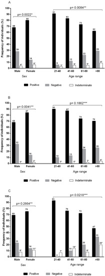 Frequencies of anti-SARS-CoV-2 antibodies according to sex and age group. (A) Pooled frequencies of anti-SARS-CoV-2 total antibodies (S1/S2) plus anti-SARS-CoV-2 IgG neutralizing antibodies (RBD-S1). Sample size by sex: male (n = 138) and female (n = 220). Sample size by age group: 21–40 (n = 35), 41–60 (n = 60), 61–80 (n = 221), and >80 (n = 42). (B) Frequencies of total anti-SARS-CoV-2 antibodies (S1/S2). Sample size by sex: male (n = 77) and female (n = 128). Sample size by age group: 21–40 (n = 20), 41–60 (n = 39), 61–80 (n = 119), and >80 (n = 27). (C) Frequencies of neutralizing IgG anti-SARS-CoV-2 (RBD-S1) antibodies. Sample size by sex: male (n = 61) and female (n = 92). Sample size by age group: 21–40 (n = 15), 41–60 (n = 21), 61–80 (n = 102), and >80 (n = 15). * Indeterminate results were not included in the statistical analysis; ** chi-square test; *** G test.