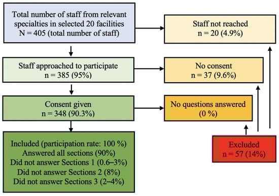 A total of 348 participants (90.3% of those eligible) from the 20 randomly selected health facilities (from a total of 36 health facilities located in Yerevan) completed the survey and were included in the final analysis (Figure 1).