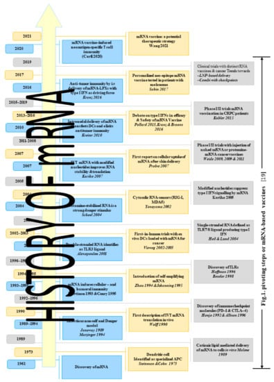 In this section, we briefly discuss the history of mRNA vaccination and their clinical applications, as summarized in Figure 1. Messenger RNA (mRNA) was discovered within the same month of the splitting of the genetic code during the summer of 1961, in which two articles announcing the isolation of mRNA were published [10]. Later in the same month, another review paper was published in Journal of Molecular Biology in which mRNA was theoretically addressed, and its role in gene regulation was argued [10].