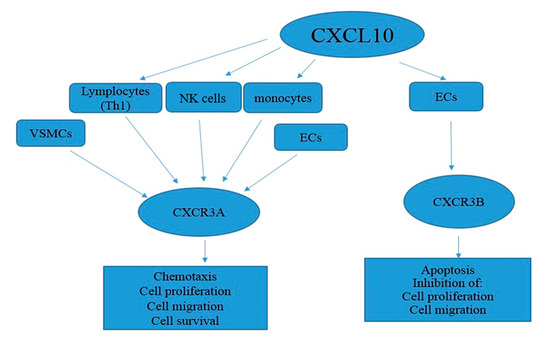 Cardiovascular disease (CVD) is defined as one of the leading causes of mortality, accounting for over 15 million deaths worldwide [1,2]. CAD is one of the most common forms of severe CVD and has a major impact on personal health accompanied with high mortality, hospitalization rates and healthcare expenses (approximately 312 billion USD per annum in the USA) [3,4]. According to the most recent studies, atherosclerosis—defined as a chronic inflammatory state affecting both the medium and large arteries—constitutes the main underlying cause of CVD [5,6]. The activation of the vascular endothelium, along with the accumulation of lipids, immune cells and cell debris, leads to atherosclerotic lesion formations prone to ruptures and thromboses as well as further partial or total arterial occlusions [5,7]. The progression and rupture of atherosclerotic lesions are predisposed to cardiac and cerebral ischemic events causing myocardial infarctions and strokes, respectively. White blood cells (WBC) play a crucial role in the initiation and progression of atherosclerosis [8,9,10] as a developing inflammatory disorder. Chemokines, a subgroup of the cytokine network, may serve as pro-migratory factors for a broad variety of cell types expressing the appropriate trans-membrane G-protein and specialized chemokine receptors. These low molecular weight cytokines are sub-classified into C, CC, CX3C and CXC based on the position of the conserved cysteine motifs within their biochemical structures [11,12]. In addition, based on the presence or absence of the enzyme-linked receptor (ELR) group (a motif containing glutamine-leucine-arginine adjacent to the cysteine residues), CXC chemokines are further divided in two subgroups: ELR, which stands for the three amino acid residues Glu-Leu-Arg (ELR), and the ELR− and ELR+ chemokines such as the CXC motif chemokine ligand 1 (CXCL1), CXCL2 and CXCL3, which act as neutrophil chemo attractants. ELR-CXC chemokines including CXCL10 and CXCL12 serve as pro-migratory agents of peripheral blood mononuclear cells (PBMC) such as lymphocytes, monocytes and natural killer (NK) cell types [13,14]. CXCL10 chemokine, known as interferon γ (IFN-γ)-inducible protein 10 (or IP-10) was initially discovered as an IFN-γ-induced protein produced by a wide spectrum of cell types varying from endothelial cells [15], monocytes [16,17], keratinocytes [18], neutrophils [19], dendritic cells [20] and fibroblasts [21] to hepatocytes [22], and mesenchymal cells [23,24]. The common but not specialized receptor for CXCL10 is CXCR3 [25]. The CXCL10/CXCR3 axis is essential for white blood cell (WBC) migration toward damaged and inflamed tissues, leading to further tissue injury [26]. Moreover, chemokines control the migration of immune cells toward infection/inflammation areas and injured tissues [24,27]. Beyond inflammation perpetuation and immune cell migration, chemokines are also involved in other functional activities such as new blood vessel formation, known as angiogenesis, or the inhibition of the former, called angiostasis [14,28]. More than 50 chemokines and 20 chemokine receptors have been recognized to date [29]. Multiple members of CXC chemokines have been confirmed to be involved in inflammatory conditions such as type-1 diabetes [30], Behcet’s syndrome, diabetes mellitus [31], osteoporosis [32], preterm delivery [33], cancer [34], systemic lupus erythematosus (SLE) and tick-borne encephalitis. However, a clear relationship between chemokines and CAD needs to be fully elucidated. The main goal of the present review is the elucidation and clarification of the role of CXCL10 as an inflammatory mediator for atherosclerosis progression and further CAD.