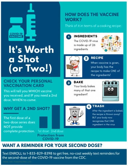 We reasoned that heightened vaccine hesitancy due to misunderstandings about how the COVID-19 vaccine works could exacerbate the attempts of pharmacists and physicians to administer the complete series of two-dose COVID-19 vaccines to recipients. To counteract the role of vaccine hesitancy and misunderstandings in interfering with follow-up visits for the second intended dose of the two-dose COVID-19 vaccine series, the infographic in Figure 1 was created to explain, using lay terminology, how the COVID-19 vaccine works and the benefits of completing the multidose series in its entirety. In developing the content of the infographic, we sought input from community advocates and leaders in clinical pharmacy. The infographic conveys the following information to readers: