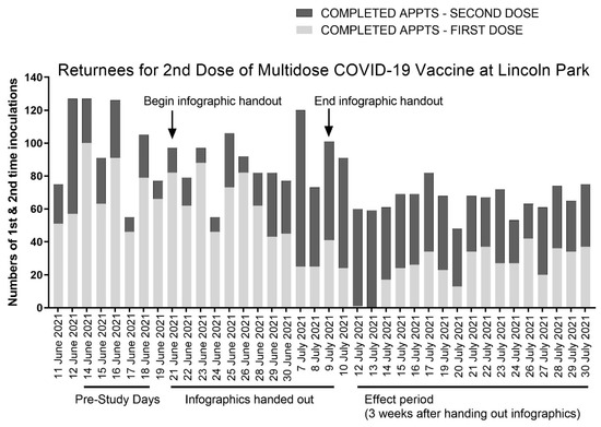 The COVID-19 infographic shown in Figure 1 was distributed between 21 June and 9 July 2021. Subsequently, we reviewed site records of 2951 visitors to the Lincoln Park COVID-19 Vaccination POD between 11 June and 30 July to determine the numbers of daily appointments serving individuals receiving first and second doses of the Pfizer COVID-19 vaccine before, during, and after the period during which COVID-19 infographics were distributed (Table 1), excluding days that fell on the weekends and over the 4 July holiday when the Lincoln Park Vaccination POD was closed.