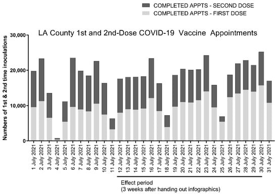 The study endpoint was determined based on the dates during which the COVID-19 Vaccine Infographic was handed out: 21 June through 9 July 2021. A study endpoint of 30 July was determined based on the corresponding 21 day duration from the date the last COVID-19 Vaccine Infographic was distributed, since recipients of the Pfizer vaccine are advised to return for a second inoculation 21 days after the first inoculation of the series. The number of returnees to the Lincoln Park COVID-19 Vaccination POD were determined from site records by tallying the numbers of daily completed first- and second-dose appointments for the Pfizer vaccine. Statistics were aggregated from a 7 day pre-study period to determine the typical numbers of daily first- and second-dose appointments for the Pfizer vaccine in the week preceding the initiation of our study. Statistics from the effect period were assessed from 12 to 30 July, corresponding to a window 21 days’ delayed after which the COVID-19 vaccine infographic was handed out. Raw numbers of completed first- and second-dose appointments are reported in Tables 1 and 2 and are plotted as a stacked bar plot in Figures 2 and 3. County-wide vaccine statistics were obtained from public records from the California Department of Public Health and the Los Angeles County Department of Public Health. Means of the data and variabilities, calculated as the standard deviation, are reported in the Results section.
