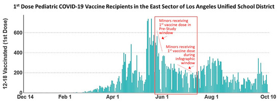 Pediatric vaccine recipients scheduled for second-dose COVID-19 vaccine appointments during the pre-study window (14–18 June) received their first vaccine between 24 and 28 May. Pediatrics scheduled for the second vaccine dose during the effect period (12–30 July) of our study received their first vaccine dose between 21 June and 9 July, coinciding with distribution of the COVID-19 vaccine infographic. The data shown in Figure 4 reveal a greater number of pediatrics receiving the first dose of the COVID-19 vaccine in the timeframe between 24 and 28 May, corresponding to the pre-study group, relative to the group analyzed during the effect period who received the first COVID-19 vaccine dose between 12 and 30 July. These data show a general declining trend in the numbers of pediatric vaccine recipients throughout the study timeline, indicating that numbers of pediatrics did not remain stable throughout the study, and rates of adherence cannot be correlated with any one specific age demographic.