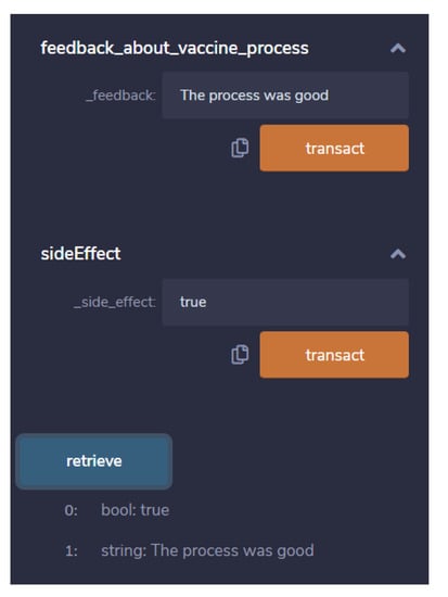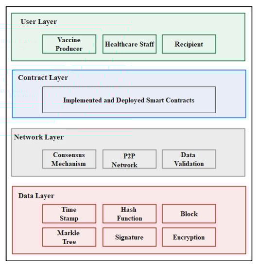 The data layer and network layer are part of the blockchain environment whereby the data layer acts as a core layer that is responsible for the storing and chaining of data whereas the network layer’s task is to perform transmission of data, data validation, consensus mechanisms and peer-to-peer networking in the blockchain network. The smart contract layer contains all the contracts that are responsible for every event done in the network and the smart contracts layer also acts as the core of the complete system that encapsulate the coding and delivers the functions to the system []. Smart contracts include the code and deployment for vaccine distribution tractability and anti-counterfeiting. The user layer, also called the application layer, allows the recipient, healthcare workers and all the peers in the vaccine distribution system to interact with the interface of the blockchain network.