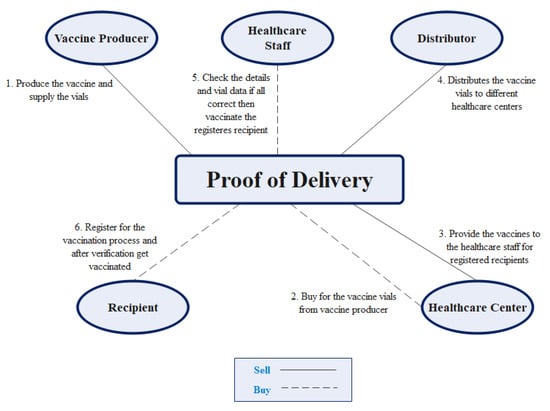 All the data of all the actions is stored in distributed ledgers that are immutable in nature and is accessible by all the participants of the network. Thus, it enables the feature of transparency at each level and records the data regarding registration for vaccination of COVID-19 vaccines as a digital asset. Figure 3 presents the proof of delivery model.