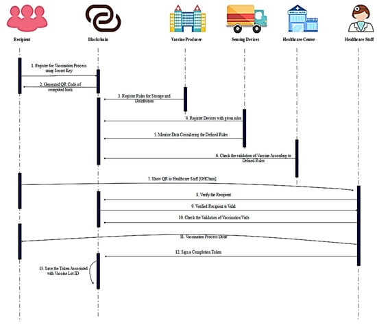 The proposed system has five participants in the network including the recipient, healthcare workers, laboratory staff, and administrative and healthcare center staff as shown in Figure 4. The detailed execution of recipient registration and chain monitoring of distribution process are described in the following subsections: