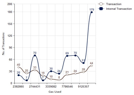 In blockchain a single block consists of various internal and external transactions. In Figure 8 the relationship between transactions and gas consumed has been presented. The relation concludes as the number of transactions increases the gas consumption will also increase therefore, they are directly proportional to each other: