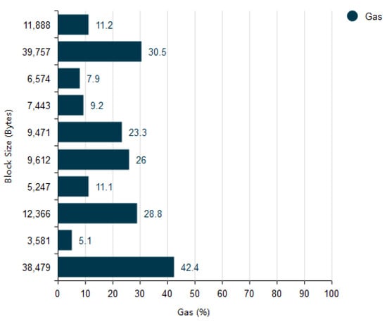In Figure 9 the relationship between the gas consumed based on the size of the block is shown. The relationship shows as the block size increases the gas consumption will also increase as shown in figure when the block size is 3581 the gas consumed percentage is 5.13% and when the block size is 38479 then the gas consumption percentage is 42.4% which shows both gas consumption and block size are directly proportional to each other.