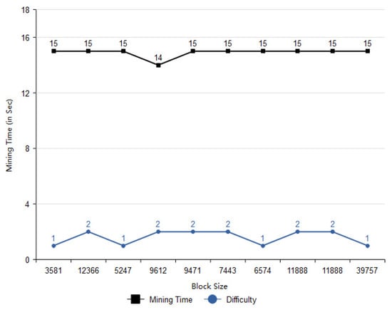 In order to compute the mining time with respect to the particular block size, a bar graph is plotted as shown in Figure 10. The authors have provided different size of blocks in order to investigate the time of mining for each block. As shown in Figure 10, difficulty is a measure of unit to calculate the difficulty during the mining process. It has been observed that the time of mining does not depend upon the size of block. However, the mining time is dependent on the mining process of the network.
