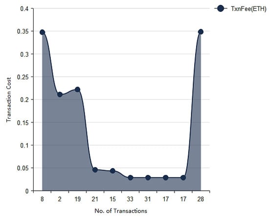 In Figure 11 the cost of each transaction has been presented depending upon the number of transactions done by respective block. As shown in figure on the x axis the transaction cost has been shown and on y axis block number (block ID) has been presented. The transaction cost depends on the type of input also on the number of transactions in a block. The transaction cost is in Ethers. The transaction cost may vary according to the size of blocks in blockchain as shown in Figure 12.