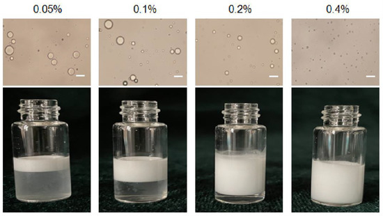 Optical micrographs and the appearance of Pickering emulsion prepared with different particle concentration. Scale bar = 10 μm.