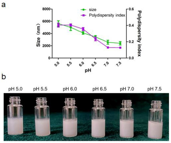 Alum particle dispersion (0.4% w/v) was prepared using citrate acid buffers with different pH (5.0–7.5) and sheared with squalene to fabricate Pickering emulsions. The size and the appearance of emulsions varies with aqueous pH were depicted in Figure 4. The particle surface hydrophobicity can be adjusted by controlling the pH of the aqueous phase, which further affects the wettability of the particle surface and changes its adsorption characteristics at the oil/water interface. As shown in Figure 4a, the droplet sizes decreased when pH increased. Evidently, the polydispersity index of Pickering emulsion was less than 0.2 when the pH of aqueous phase was above 7.0, which indicated that the Pickering emulsions have uniform size distribution and good dispersibility. All the emulsions presented poor uniformity at pH from 5.0 to 6.0. These observations could be attributed to the decrease in electrostatic repulsions as the pH values increase that led to the collapse or aggregation of polymer chains at the oil-water interface. Correspondingly, the decrease in the repulsion forces might have allowed the deposition of non-adsorbed particles on the droplets, which possibly reinforced the stability of the Pickering emulsions [26]. Thus, pH of 7.5 was choose as the optimal pH condition for the aqueous phase.