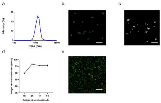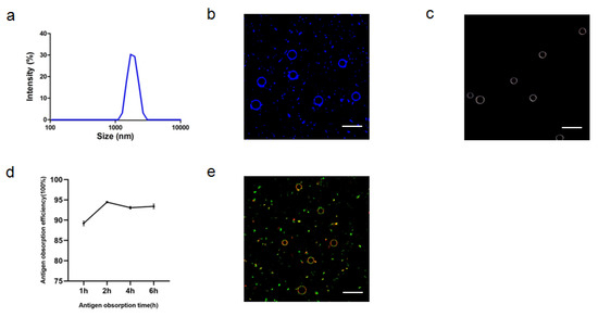 After optimizing the preparation conditions, ALPE and ALMPE were obtained (Figure 5 and Figure 6). The zeta potentials of ALPE and ALMPE were 19.7 ± 3.2 mV and 21.0 ± 2.9 mV, respectively. The average size of ALPE and ALMPE were 2384 ± 72 nm and 1659 ± 58 nm, the polydispersity index of ALPE and ALMPE were 0.110 ± 0.037 and 0.190 ± 0.056, respectively (Figure 5a,b). It is speculated that the addition of MLPA makes the particles more adsorbed on the oil-water interface and reduces the surface tension value, thus forming petite droplets. How could objects with such sizes be safely internalized into the cells? Regardless of whether the antigen is desorbed from the surface of the adjuvant, the antigen must enter the lymphatic system before it can reach the lymph nodes, thereby stimulating B cells and T cells. Particles with a size of 20–1000 nm can be taken up by cells (DC or cells that can be swallowed by DC). Particles in the range of 1–30 nm can pass through the lymphatic system for DC internalization or directly enter the lymph nodes as free antigens [27,28].
