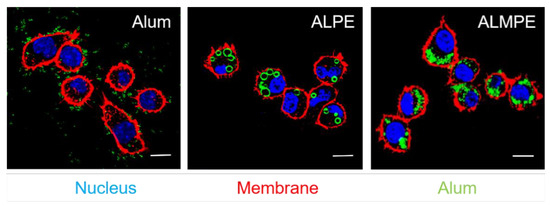 BMDCs were incubated with ALPE to investigate the cellular distribution of ALPE and ALMPE in vitro. As shown in Figure 8, potent cell-residing ALPE and ALMPE were proved, but alum tended to condense on DC membranes without entering the cells. Consequently, ALPE and ALMPE may have the potential to mediate the intracellular transfer of antigens.