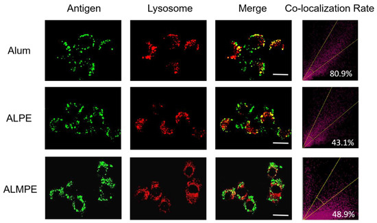 The intracellular distribution of the antigen was then observed with CLSM. For exogenous antigens, efficient endosomal escape is the key step for efficient cytotoxic T lymphocyte response and is essential for enhancing the cellular immune response. Using OVA antigen as model, after incubation 24 h, ALPE and ALMPE obviously increased cytoplasm-residing antigens with lower co-localization compared to Alum (Figure 9). The results indicated that ALPE and ALMPE can promote the uptake of antigen by cells and is expected to provided powerful cellular immune response.