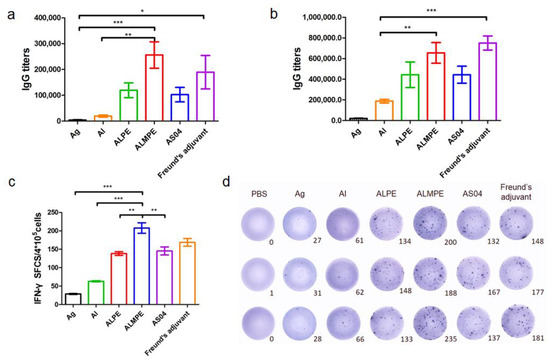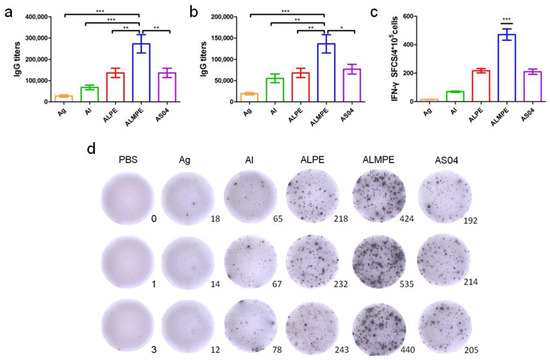 Next, the systemic immune responses in mice after subcutaneous injections were evaluated. For systemic immunity, humoral and cellular immune responses were investigated. As shown in Figure 10a,b, ALPE and AS04 triggered the same level of secretion of specific antibody IgG titters that are higher than alum adjuvants. ALMPE treated mice exhibited strong IgG responses following vaccination, while injection with OVA alone induced only a weak immunogenic response. ALMPE enhanced the production of OVA-specific antibodies by 9.8-fold at day 28 (p < 0.01) and 7.1-fold at day 35 (p < 0.05), as compared with the responses to ALPE and AS04. Then, the impact of ALPE and ALMPE on T cell responses was determined. Furthermore, the number of IFN-γ secreting cells were evaluated at the single cell level via ELISPOT assay. According to Figure 10c,d, the number of IFN-γ-secreting cells in the mice immunized with ALMPE were about 2.24-fold higher than that of ALPE and AS04 treated group (p < 0.005). Consequently, these data showed that ALMPE stimulated an effective humoral and cellular immune responses.