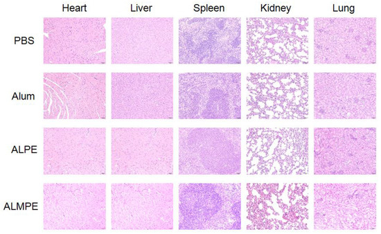 The safety and biocompatibility of ALPE and ALMPE was evaluated by analyzing the key factors such as serum biochemical parameters and histological changes of important organs, taking the PBS injection group as the blank control group. Blood urea nitrogen (BUN), alanine aminotransferase (ALT), aspartate aminotransferase (AST), lactate dehydrogenase (LDH), and alanine aminotransferase (ALP) of all groups were in the healthy level (Table S1, Supplemental Data). Moreover, a histological analysis of major organs, such as heart, liver, spleen, kidney, and lung showed no evident difference among the all groups (Figure 12). On the whole, compared with Freund’s adjuvant, which had obvious side effects and thus is not possible to use as a human vaccine [32,33], ALPE and ALMPE were verified with excellent biocompatibility.