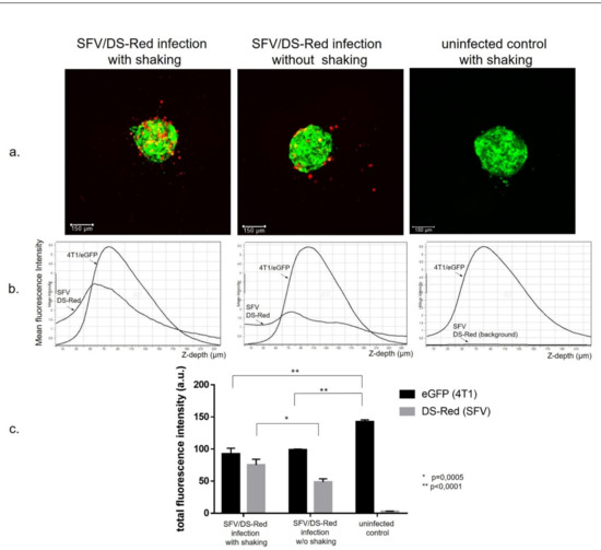 First, we evaluated the ability of the SFV vector to deliver transgenes to spheroids under 3D infection conditions. For this purpose, we generated eGFP-producing 4T1 spheroids (4T1/eGFP) cultured for 18 h in nonadherent 96-well plates at a concentration of 3 × 103 cells in 100 µL. The cancer cells, in contrast to macrophages, aggregated and formed tight 120–150-µm-diameter single spheroids within 18 h of incubation of the cell suspension in each well. The 4T1/eGFP spheroids were infected with SFV/DS-Red virus (1 × 105 i.u. per well) and DS-Red gene expression was analyzed by live fluorescence confocal microscopy at 48 h post-infection (Figure 1a, maximum intensity projection images). The confocal z slices of each spheroid were acquired every 5 µm for a total of 48 imaging planes and the mean fluorescence intensity of every confocal slice was plotted as a function of its z depth (Figure 1b). The image analysis revealed that the DS-Red-positive cells were mostly located on the surface of the spheroids with nonhomogeneous penetration into the spheroid (Figure 1b). As expected, shaking of the spheroid plate during incubation with a virus significantly enhanced the infection efficiency (total DS-Red fluorescence intensity) and penetration of the virus into deeper spheroid slices (Figure 1b,c). We concluded that the SFV vector infects the 4T1 spheroids in 3D conditions; however, virus spread within the spheroid was limited. Furthermore, confocal microscopy images revealed different growth patterns of infected and uninfected spheroids. Infected spheroids displayed less total eGFP fluorescence signals (p < 0.0001; Figure 2c) and the size of the spheroids was visually smaller, indicating the inhibitory effect of the infection.