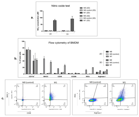 Expression of macrophage polarization markers was analyzed by flow cytometry. The panmacrophage CD11b surface marker was detected in 80–90% of BMDMs and was decreased upon cultivation in 3D conditions (p < 0.05; Figure 2b). BMDMs activated by vdIFNg revealed a significant increase in the M1-like phenotype-specific markers MHCII, CD38, and intracellular inducible NO synthase (iNOs) (Figure 2b,c). While MHCII expression did not show significant differences under 2D and 3D conditions, the levels of the CD38 and iNOs M1 markers were higher in 3D than in 2D conditions (CD38, p = 0.0180 and iNOs, p = 0.0028; Figure 2b).