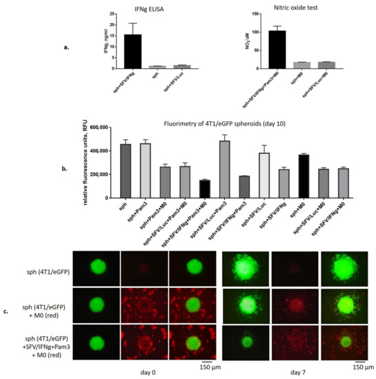 Very high (p < 0.0001) differences were revealed between untreated and treated spheroids, namely sph and sph+SFV/IFNg+Pam3+M0 and sph and sph+SFV/IFNg+Pam3 (Figure 3b). Although both SFV/IFNg and M0 showed inhibitory effects on the spheroid growth, on day 10 the inhibitory effect of the sph+SFV/IFNg+Pam3+M0 combination was significantly higher than that of the combination without macrophages (sph+SFV/IFNg+Pam3, p < 0.001), pointing to the inhibitory role of macrophages in the tested system. Measurement of NO in all groups at day 4 demonstrated that the sph+SFV/IFNg+Pam3+M0 combination triggered potent production of NO (40 µM; Supplementary Figure S1b). Furthermore, these data (Figure 3b, Supplementary Figure S1b) were supported by the quantification of luminescence signals produced by the spheroid lysates prepared at day 10 (Supplementary Figure S1c). Altogether, this demonstrated the inhibition of spheroid growth in the presence of SFV/IFNg and macrophages compared to the untreated controls (p < 0.0001).