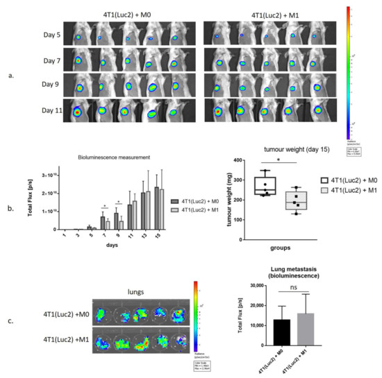 We also assessed the infiltration of tumor cells into the distal organs, namely the lungs as the organs mostly affected in the 4T1/4T1luc2 model [45]. For this, we assessed the bioluminescent signals emitted by organs by ex vivo imaging performed immediately after their dissection as previously described [46]. The bioluminescent signals emitted by the lungs of 4T1(Luc2)+M1- and 4T1(Luc2)+M0-implanted mice did not differ (Figure 4b,c), indicating that M1 macrophages had no long-term effect on the migration of tumor cells registered by the experimental end-point.