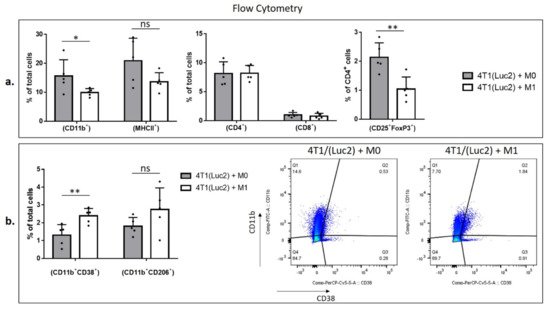 Flow cytometry analysis of immune cells isolated from tumors generated by implantation of 4T1(Luc2) cells premixed with M0 or M1 macrophages. Tumors were homogenized and a single cell suspension was used for immunostaining (see Materials and methods for the details). Flow cytometry was performed to quantify the immune cell populations (%): (a) CD11b+; MHCII+; CD4+; CD8+ in total single cells and CD25+/FoxP3+ in the CD4+ population; and (b) double positive CD11b+/CD38+, CD11b+/CD206+ cells in total single cells. Representative flow cytometry gating data of CD11b+ and CD38+ cells are shown. Bars represent the means ± SD (n = 5); * p < 0.05; ** p < 0.01; ns—nonsignificant.