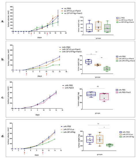 To evaluate the antitumoral potential of SFV/IFNg virus, we used orthotopic (orth.) and subcutaneous (sc.) 4T1 murine models (n = 5). Two intratumoral (i.t.) injections of the vector (4 × 107 i.u./tumor) were performed: the first injection was given as soon as the tumors became palpable (day 7 for s.c. model; day 4 for orth. model); the second repeated injection was performed six days later (Figure 6a,b; red arrows indicate the vector/PBS injections). Furthermore, to stimulate macrophage polarization to M1, we treated the mice with Pam3 ligand. The day after virus vector administration, the mice received i.t. injections of the Pam3 ligand solution at 10 µg (first injection) and 15 µg (repeated injection) per tumor). Tumor growth was measured regularly at 17 (s.c.) and 14 (orth.) days. At the end of the experiments, the tumors were resected and weighed. The tumor growth curves for all individual animals are presented in Supplementary Figure S4. Although in the s.c. model, a trend of tumor growth inhibition was observed in the SFV/IFNg+Pam3-treated group, the tumor growth parameters and the final tumor weights varied within each group; therefore, the observed inhibition did not reach the level of significance (Figure 6a). The statistical significance (Mann–Whitney t-test) of the tumor volume of groups treated with SFV/Luc (sc.SFV/Luc+Pam3) and SFV/IFNg (s.c.SFV/IFNg+Pam3) on the last day (day 17) reached the probability level of p = 0.2103 (nonsignificant).