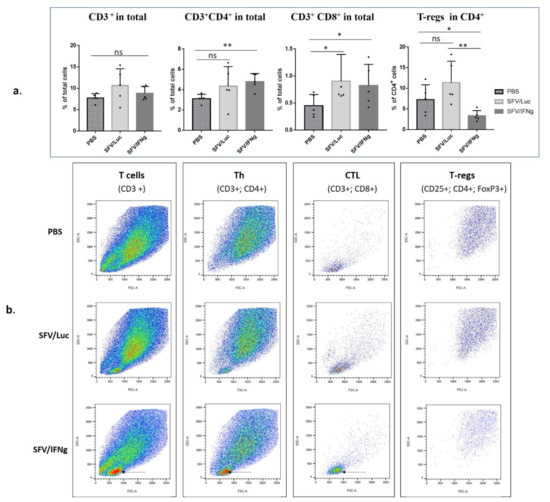 Flow cytometry analysis of T cells in the tumors treated with SFV/IFNg, SFV/Luc, or PBS in orthotopic 4T1 mouse breast cancer model (mice were treated as presented in Figure 6d). Resected tumors were homogenized to obtain a single cell suspension, which was used for immunostaining with antibodies against surface markers (CD3, CD4, CD8, CD25) and intracellular markers (FoxP3) in one mixture. (a) Percentages of cell populations. Th cells were identified as CD3+/CD4+; CTL cells as CD3+/CD8+, and T-regs as CD4+/CD25+/FoxP3+ populations. (b) Representative pictures of forward and side (SSC-A/FSC-A) scattering of the cell populations. Arrows indicate the increased population of lymphocytes in the SFV/IFNg group. Bars represent the means ± SD (n = 5); * p < 0.05; ** p < 0.01; ns—nonsignificant.