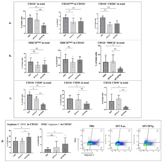 The analysis of myeloid cell populations in vivo is not a trivial task because these cells are highly heterogeneous and express overlapping markers at various stages of maturation. The basic phenotypic classification of myeloid cells is based on the CD11b surface marker, which is highly expressed on myeloid cells, including tumor-associated macrophages (TAMs). We observed a significant decrease in CD11b+ cells in the SFV/IFNg-treated tumors compared to those in the PBS group (p = 0.004) (Figure 9a). The SFV/Luc group revealed a high variability of CD11b+ cells. Still, there was a positive correlation between CD11b% and tumor weight (Pearson’s correlation coefficient r = 0.9249; p = 0.0244), indicating that small tumors are characterized by low number of CD11b-expressing myeloid cells (Supplementary Figure S5a). Similar results were obtained for the M1 co-injected tumors (Figure 5a). Interestingly, the CD11bhigh population within CD11b+ cells was decreased both in the groups treated with SFV/IFNg and with SFV/Luc compared to the PBS group (although the latter with lower significance; p = 0.0278 and p = 0.0476, respectively) (Figure 9a). We also observed a decrease in protumorigenic CD11b+/CD206+ M2 macrophages in the SFV-treated tumors compared to the PBS-treated tumors (p = 0.0040 for both SFV/IFNg and SFV/Luc; Figure 9a). The CD11b+/CD206+ cells were highly positive for Arginase 1, confirming their M2 phenotype (Supplementary Figure S6a). The percentages of CD206+ cells in the CD11b cell population did not change (Supplementary Figure S6b).