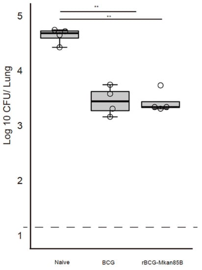 BCG or rBCG-Mkan85B vaccination protects against M. kansasii infection. The CB6F1 (H2b/d) mice were either left unimmunized or immunized with BCG or rBCG-Mkan85B for 6 weeks, followed by intratracheal infection with a virulent M. kansasii strain. The mice were sacrificed at 6 weeks after M. kansasii infection. The immunization schedule is shown Figure S1A. The number of M. kansasii in individual mouse lungs was analyzed using the colony assay method. The data represent two independent experiments with three to four mice per group. The detection limit for bacilli in the tissue homogenate was 15 CFU. The error bars represent the SD. ** p < 0.01.