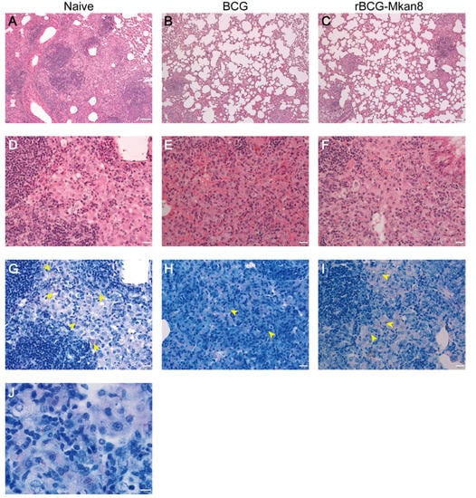 Histopathology of lungs from M. kansasii-infected mice. Representative pathological observations of the lungs of the unvaccinated (A,D,G,J), BCG-vaccinated (B,E,H), and rBCG-Mkan85B-vaccinated (C,F,I) mice 6 weeks after M. kansasii infection are shown. First-row panels, 100× of HE-stained specimens; second-row panels, 400× of HE-stained specimens; third-row panels, 400× of Ziehl-Neelsen-stained specimens; (panel J), 1000× of Ziehl-Neelsen-stained specimens. The yellow arrowheads indicate the acid-fast bacilli. Bars: 100 μm (first-row panels), 20 μm (second- and third-row panels), and 10 μm (panel J).