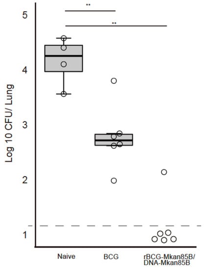 Mice were immunized with the BCG vaccine or rBCG-Mkan85B at a concentration of 4 × 106 CFU or 0.1 mg of bacilli intradermally (i.d.), and 100 µg of plasmid DNA in saline intramuscularly (i.m.) three times [] (Figure S1A,B). We used three to four mice per group.