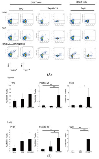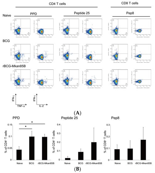 M.kansasii-specific polyfunctional CD4+ and CD8+ T cells in BCG- or rBCG-Mkan85B-vaccinated CB6F1 mice. (A) A representative fluorogram of epitope-specific polyfunctional CD4+ and CD8+ T cell inductions in splenocytes from unvaccinated and vaccinated mice infected with M. kansasii; TNF is shown on the x-axis and IFN-γ is shown on the y-axis. (B) Polyfunctional CD4+ and CD8+ T cells from unvaccinated and vaccinated CB6F1 mice infected with M. kansasii. Polyfunctional CD4+ T cell induction by stimulation with PPD (left panel), polyfunctional CD4+ T cell induction by stimulation with peptide 25 (middle panel), and polyfunctional CD8+ T cell induction by stimulation with Pep8 (right panel) in unvaccinated, BCG-, and rBCG-Mkan85B-vaccinated mice are shown. The data represent two independent experiments with three to four mice per group. The error bars represent the SD. * p < 0.05.