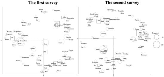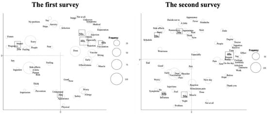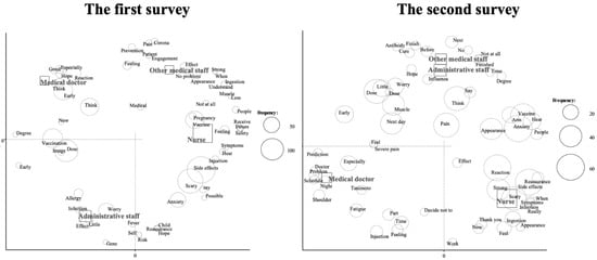 Table 3 shows a list of frequently used words among nouns and adjectival nouns. In the first survey, the most common word among 5918 words was “side effects” followed by “vaccination”, “vaccine”, “worry” and “anxiety”. In the second survey, the most common word among 7614 words was “vaccination” followed by “anxiety”, “side effects”, “reaction” and “vaccine”. Therefore, the frequency of “side effects” decreased from the first to the second survey (Table 3). In addition, “reassurance”, which was not observed in the first survey, was noted as the 13th most frequent word in the second survey.
