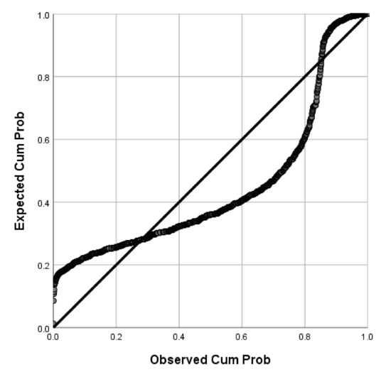 Of the participants, 71.04% (95%CI: 69–73%) were willing to receive COVID-19 vaccines in the future. P-P plots showed that the distributions of age and BMI were skewed while BAS-2 total scores were normally distributed (Figure 1, Figure 2 and Figure 3). Thus, Mann-Whitney U Tests were used to compare age and BMI and a two-sample independent t test was used to compare the BAS-2 total score difference between the two groups. As shown in Table 1, univariate analyses revealed significant differences between students who were willing to receive COVID-19 vaccines in the future versus those unwilling to be vaccinated, in terms of study major, place of residence, COVID-19 vaccine-related knowledge and attitudes, and BAS-2 scores. Specifically, participants who were willing to receive COVID-19 vaccines in the future were more likely to be pursuing a major degree in a health-related discipline (p < 0.001), to live in an urban area (p = 0.013), to have heard about COVID-19 vaccines previously (p < 0.001), to believe COVID-19 vaccines could provide protection (p < 0.001), to believe COVID-19 vaccines were safe (p < 0.001), and to report a higher BAS-2 score (p < 0.001).