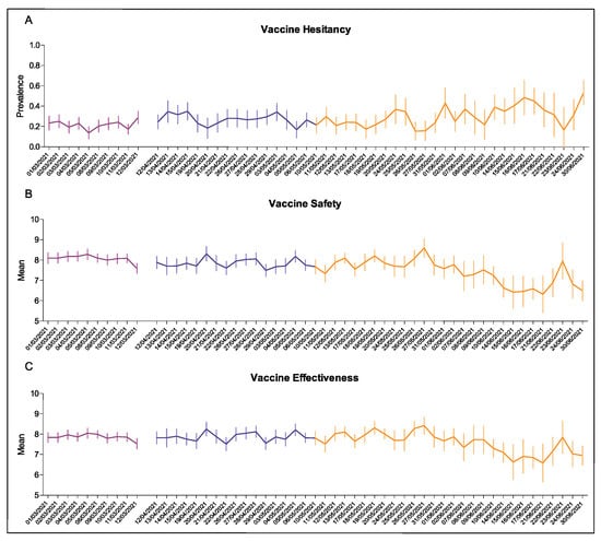 Prevalence of vaccine hesitancy (A), mean confidence in vaccine safety (B) and effectiveness (C) among the students surveyed from March 1st and 12 March 2021 (first period, purple line), from 12 April to 9 May 2021 (second period, blue line) and from 10 May to 30 June 2021 (third period, orange line) at Sapienza University of Rome.