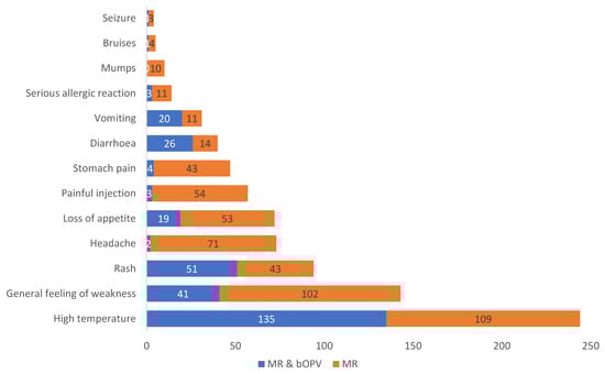 The adverse events reported were similar to the AEFIs labelled by the manufacturer in the product label. High temperature was the most reported event for both the mono dose (MR) and the combination (MR & bOPV). For the MR and bOPV 1&3 combination, the most frequently reported AEFIs in descending order were as follows: high temperature, followed by rash, general feeling of weakness, diarrhoea, vomiting, loss of appetite, and others. On the other hand, the most frequently reported AEFIs in children who were immunized with MR alone were as follows: high temperature, general feeling of weakness, headache, loss of appetite, painful injection area, stomach pain, rash, diarrhoea, vomiting, severe allergic reactions, mumps, bruises, and seizures.