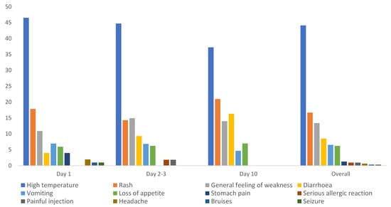 The MR live attenuated vaccine and the bivalent oral polio vaccine (bOPV 1&3) were administered together to 3658 children aged less than five years, and 3.9% reported at least one AEFI. Active AEFI reporting was performed by caretakers to community-based VHTs or by teachers in kindergartens and/or nursery schools. Overall, high temperature (44%), rash (17%), general feeling of weakness (13%), and diarrhoea (8%) were the most common AEFIs reported by this group. There were more cases of rash reported on day ten compared to the earlier days, and fewer cases of diarrhoea reported on day one compared to day 2–3 and day 10, while loss of appetite was consistently reported on all days, accounting for 6–7% of all AEFIs reported. Events such as stomach pain, serious allergic reactions, painful injection site, headache, bruises, and seizures were reported only within three days after immunization (Figure 4).