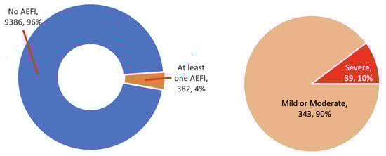 The severity of an AEFI was classified as mild, moderate, or severe. The classification was dependent on the vaccine recipient or the caretaker’s judgement or opinion and was not assessed by a clinician or according to clinical definitions. Ninety-six percent of the vaccine recipients reported no AEFIs at all. Out of the 382 (3.9%) who reported at least one AEFI, 343 (90%) categorized them as mild or moderate, and only 39 (10%) reported a severe AEFI (Figure 5). All events cleared within a few days from onset.
