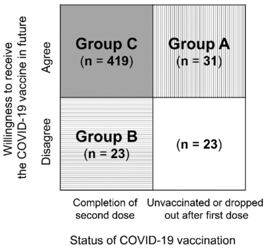 Status of COVID-19 vaccination and willingness to receive the vaccine. Note. The box shaded with vertical lines represents students (Group A) who were unvaccinated or dropped out after first dose of the COVID-19 vaccine but who were willing to receive the vaccine in future. On the other hand, the box shaded with horizontal lines represents those (Group B) who completed the second dose of the COVID-19 vaccine but were not willing to receive the vaccine in future. Furthermore, the box shaded with a gray background represents those (Group C) who were willing to receive a third dose of the COVID-19 vaccine.
